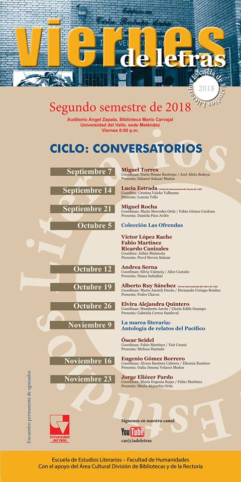 Viernes de Letras, evento de extensión creado por la Escuela de Estudios Literarios de la Facultad de Humanidades, con el apoyo del Área Cultural de la División de Bibliotecas y de la Rectoría de la Universidad del Valle, llega a su octava temporada con un ciclo de conversatorios que inicia el 7 de septiembre de 2018.
