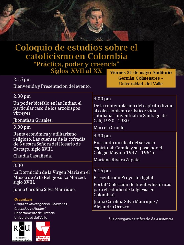 El Departamento de Historia y el Grupo de investigación "Religiones, creencias y utopías", de la Universidad del Valle, invitan al Coloquio de Estudios sobre el Catolicismo en Colombia: “Práctica, poder y creencia, siglos XVII-XX”, que se llevará a cabo los días 30 y 31 de mayo de 2019, en el Auditorio del Banco de la República y el Auditorio Germán Colmenares de Univalle, sede Meléndez.