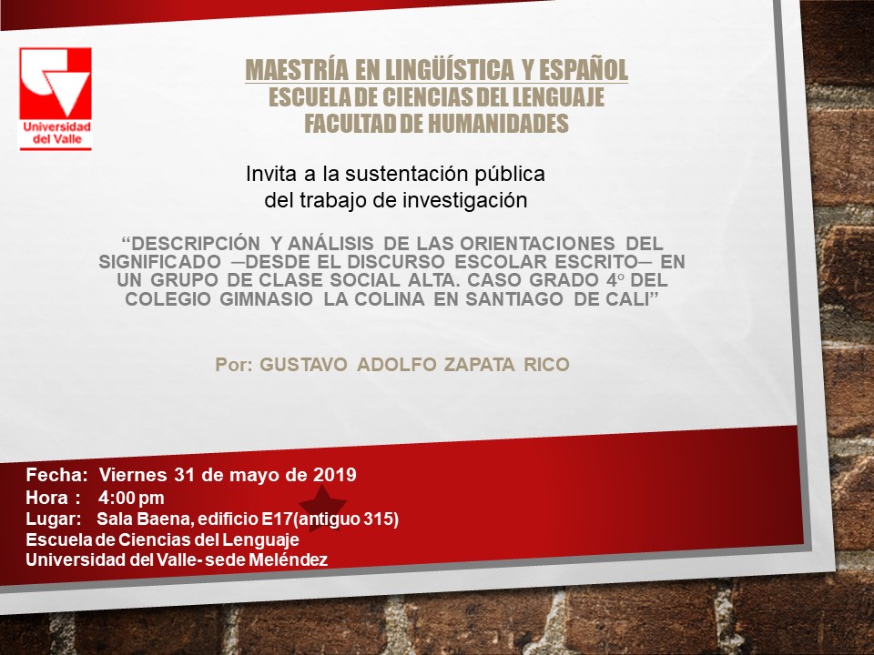 El programa de Maestría en Lingüística y Español de la Escuela de Ciencias del Lenguaje de la Universidad del Valle invita a la sustentación pública del trabajo de investigación “Descripción y análisis de las orientaciones del significado –desde el discurso escolar escrito – en un grupo de clase social alta. Caso grado 4° del colegio Gimnasio La Colina en Santiago de Cali” por parte de Gustavo Adolfo Zapata Rico.