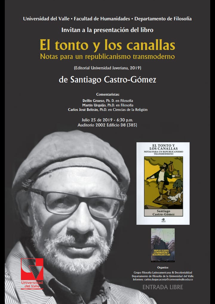 El Grupo de Filosofía Latinoamericana & Decolonialidad del Departamento de Filosofía de la Universidad del Valle, invita a la presentación del libro "El tonto y los canallas. Notas para un republicanismo transmoderno" (Editorial Universidad Javeriana, 2019) del reconocido filósofo colombiano Santiago Castro-Gómez.
