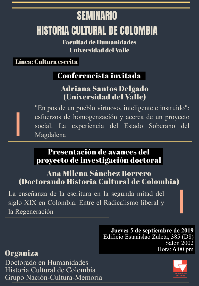 El Doctorado en Humanidades (Línea de Historia Cultural de Colombia) y el Grupo de Investigación Nación-Cultura-Memoria, adscrito al Departamento de Historia de la Universidad del Valle, se complace en extenderles invitación al Seminario Historial Cultural de Colombia del jueves 5 de septiembre de 2019 a las 6:00 p.m., en el Edificio Estanislao Zuleta, 385 (D8), Salón 2002. En esta ocasión contaremos con la compañía de la Dra. Adriana Santos Delgado, profesora titular del Departamento de Historia, y la Doctorando en Historia Cultural de Colombia, Ana Milena Sánchez Borrero, que presentará sus avances del proyecto de investigación doctoral.