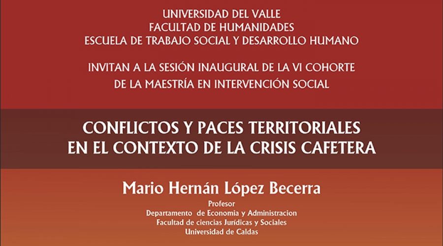 La Escuela de Trabajo social y Desarrollo humano de la Facultad de Humanidades de la Universidad del Valle, invita a la sesión inaugural de la VI Cohorte de la Maestría en Intervención Social, con la conferencia Conflictos y paces territoriales en el contexto de la crisis cafetera, por el profesor Mario Hernán López Becerra, del Departamento de Economía y Administración de la Facultad de Ciencias Jurídicas y Sociales de la Universidad de Caldas.