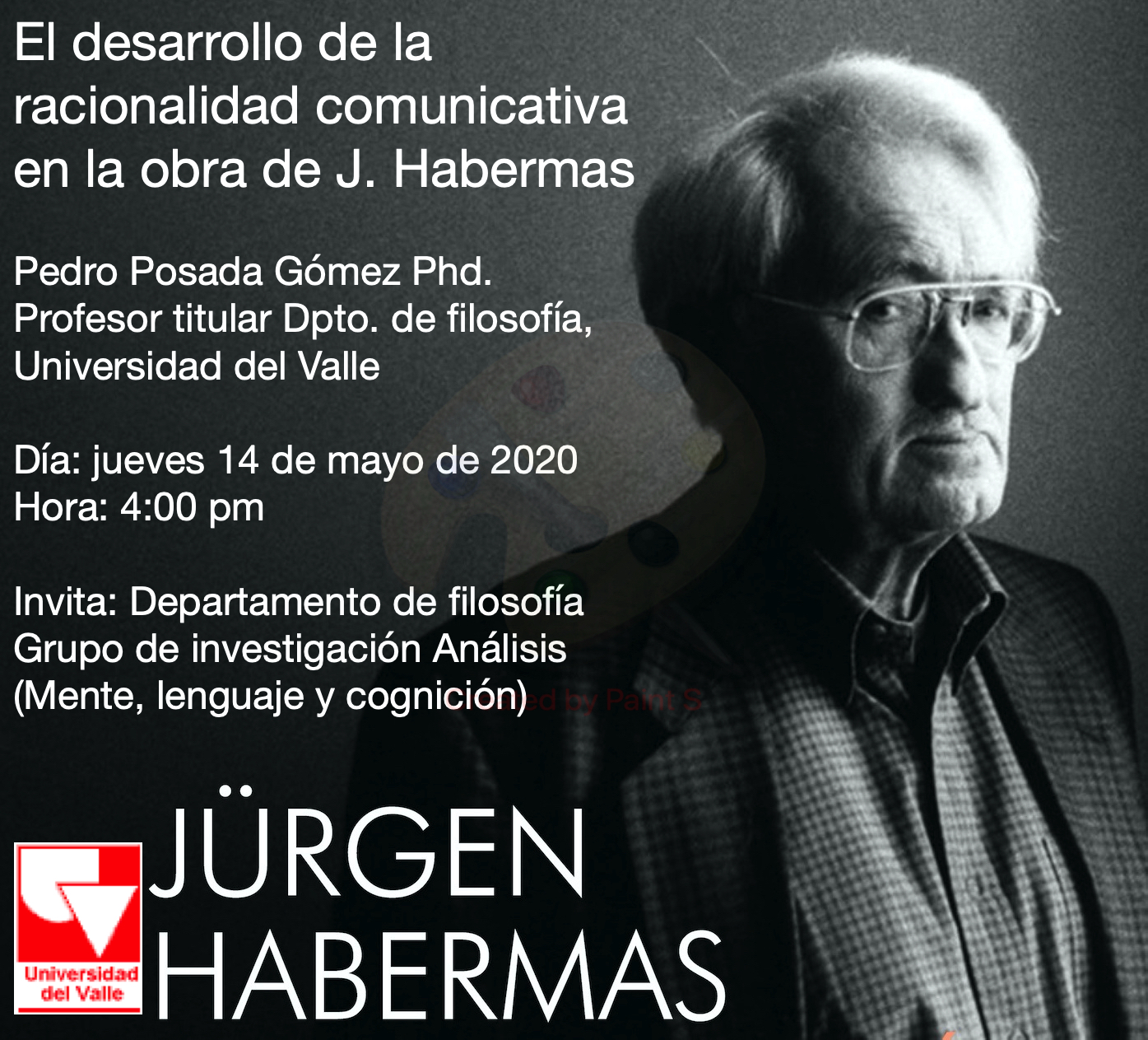 El Departamento de Filosofía de la Universidad del Valle y el Grupo de investigación Análisis: Mente, lenguaje y cognición, invita a la conferencia ‘El desarrollo de la racionalidad comunicativa en la obra de J. Habermas’, del profesor Pedro Posada Gómez Phd.