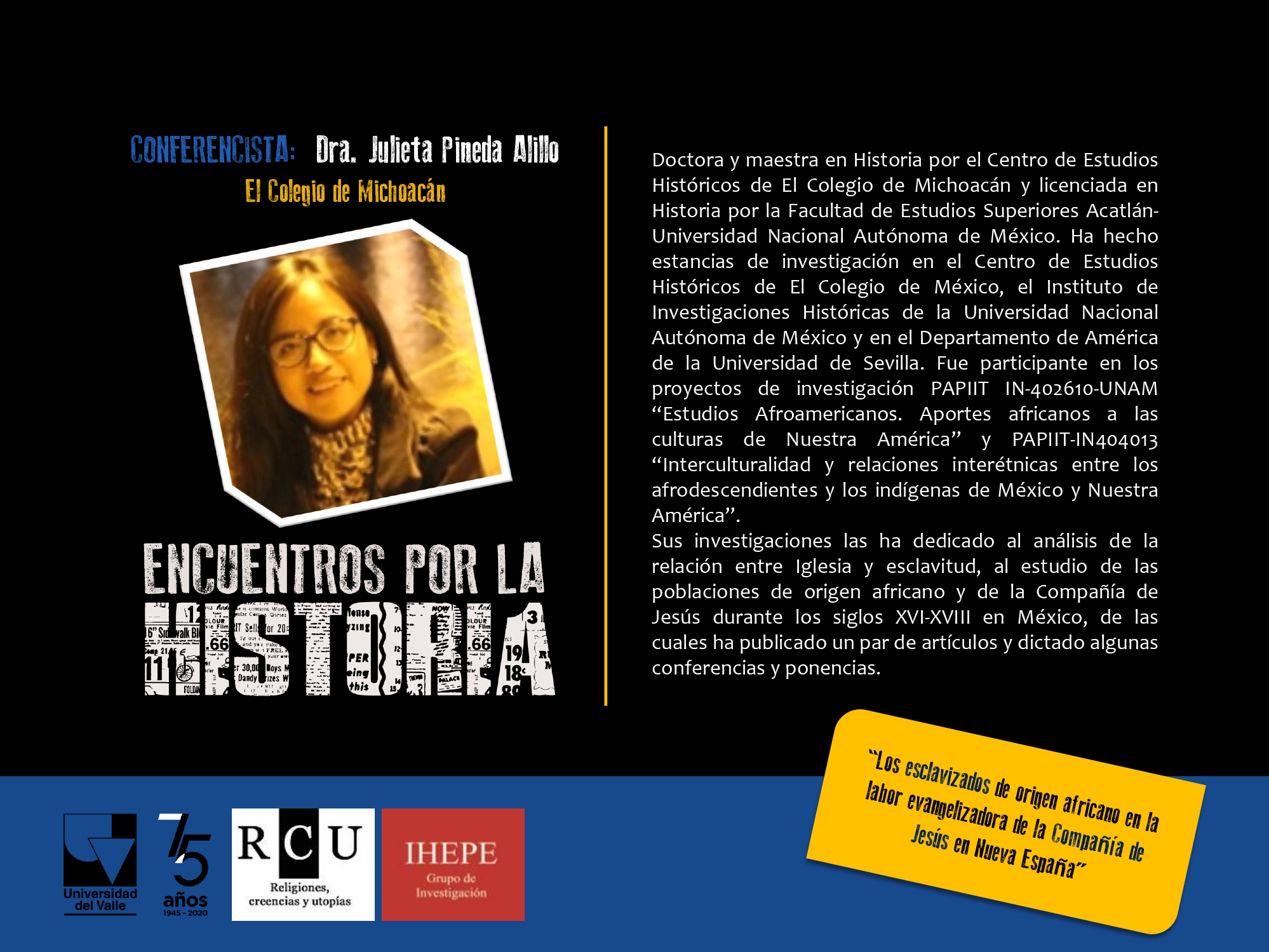 ‘Encuentros por la Historia’ es una propuesta liderada por el grupo de Investigación Religiones, Creencias y Utopías (RCU) y el Grupo de Investigaciones Históricas en Economía, Política y Educación (IHEPE), en la que a partir de la divulgación académica y la reunión con especialistas y profesores investigadores de diversos países, se socializan proyectos, reflexiones e investigaciones en la línea de la Historia o de la Enseñanza de la Historia.