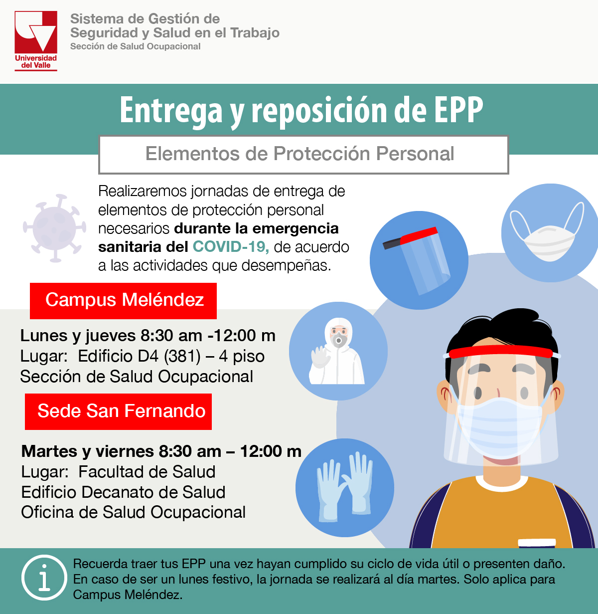 La Sección de Salud Ocupacional de la Universidad del Valle, informa los días y horarios en que serán entregados los ELEMENTOS DE PROTECCIÓN PERSONAL (EPP) a las personas que deban asistir a sus lugares de trabajo y de acuerdo con las actividades desempeñadas.