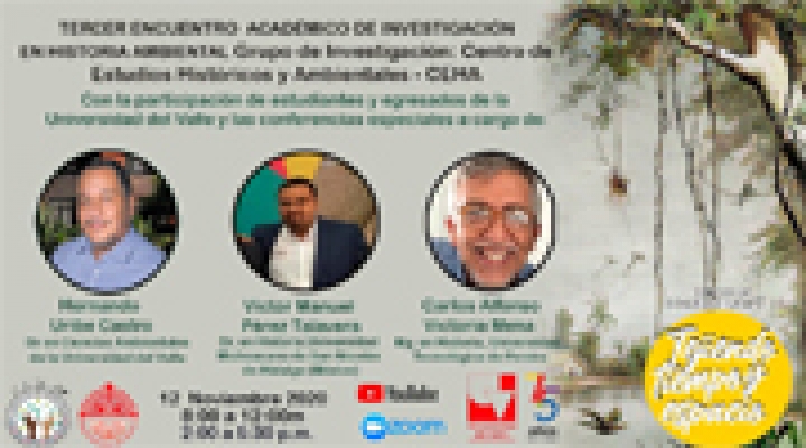 El grupo de investigación CEHA (Centro de Estudios Históricos y Ambientales) adscrito al Departamento de Historia de la Universidad del Valle, se complace en invitarles al Tercer Encuentro Académico de Investigación en Historia Ambiental que hace parte de su tercer Ciclo de Conferencias: Tejiendo Tiempo y Espacio. En esta ocasión se contará con la compañía de: Hernando Uribe Castro doctor en Ciencias Ambientales de la Universidad del Valle, Victor Manuel Pérez Talavera doctor en Historia de la Universidad Michoacana de San Nicolás de Hidalgo (México) y Carlos Alfonso Victoria Mena maestro en Historia de la Universidad Tecnológica de Pereira.