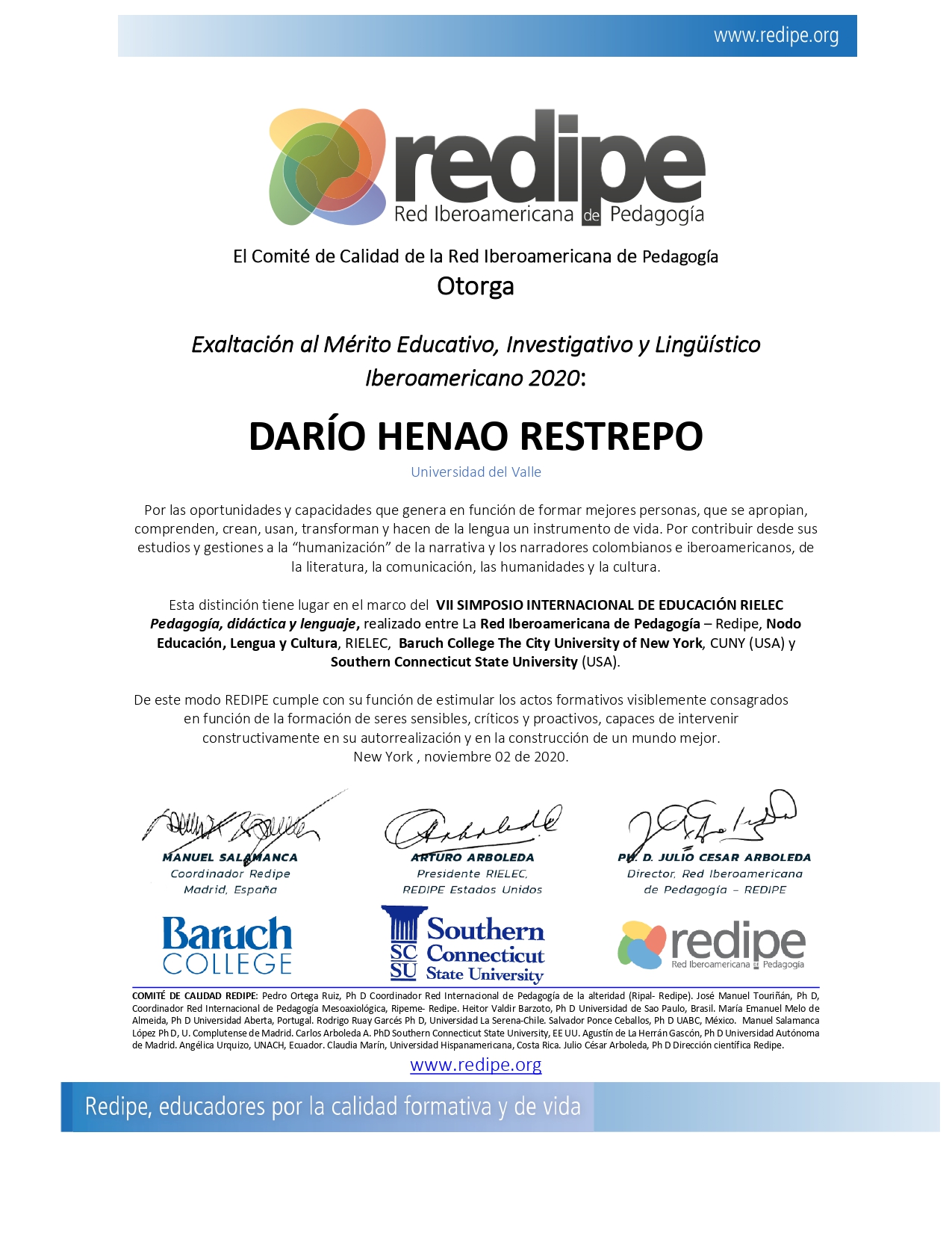 El Comité de Calidad de la Red Iberoamericana de Pedagogía, New York, otorgó la Exaltación al Mérito Educativo, Investigativo y Lingüístico Iberoamericano 2020, al profesor Darío Henao Restrepo, de la Universidad del Valle.
