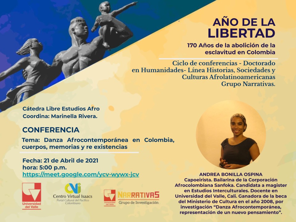 La Escuela de Estudios Literarios, el Grupo de investigación Narrativas y el Centro Virtual Jorge Isaacs de la Universidad del Valle invitan a la conferencia ‘Danza Afrocontemporánea en Colombia, cuerpos, memorias y re existencias’, que dictará Andrea Bonilla Ospina, el miércoles 21 de abril, a las 5:00 p.m., por el siguiente enlace de Google Meet