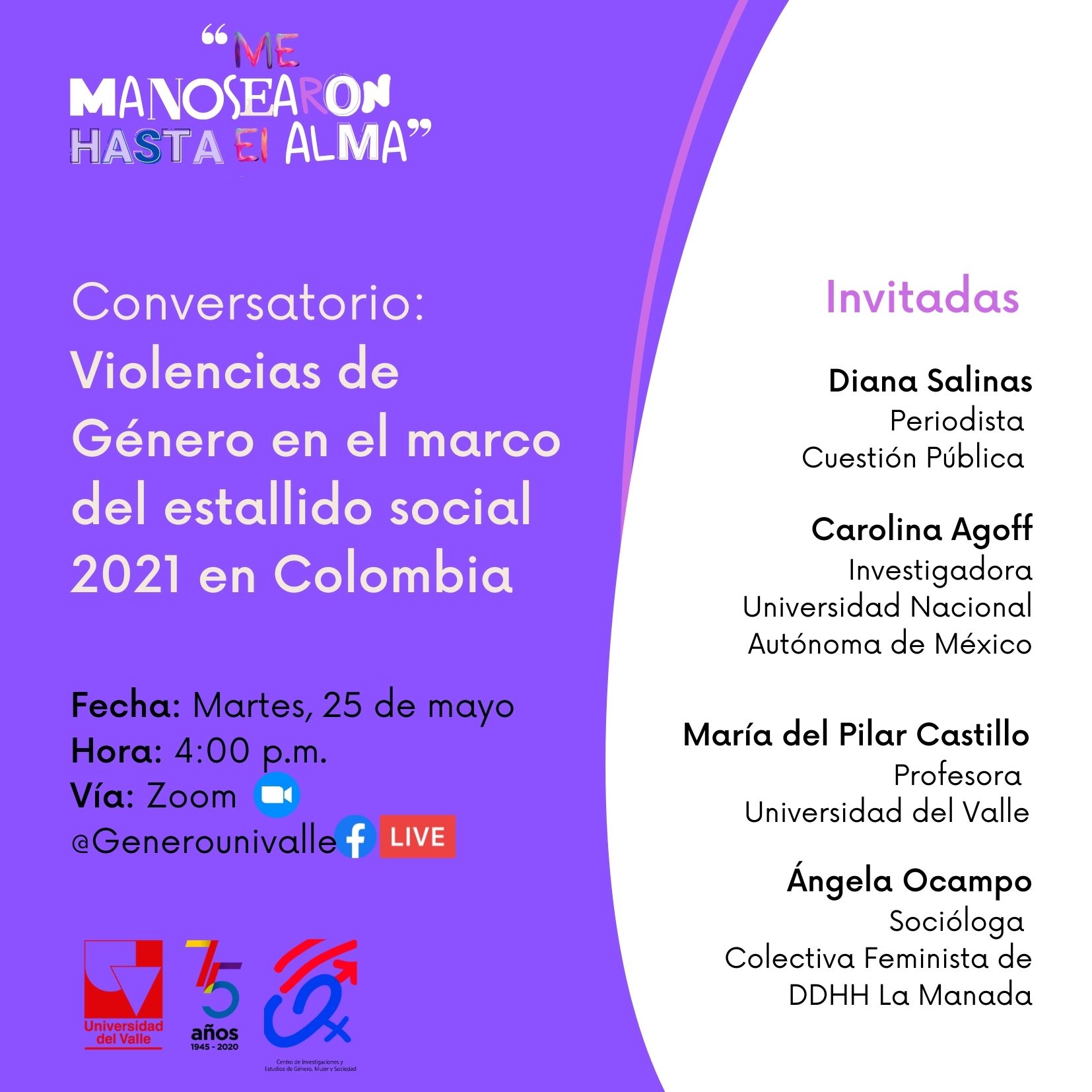 El Centro de Investigaciones y Estudios de Género, Mujer y Sociedad de la Universidad del Valle les invita a participar del Conversatorio "Violencias de Género en el marco del estallido social 2021 en Colombia”, que se realizará este martes 25 de mayo de 2021, a las 4:00 pm (COL). El evento será transmitido por la plataforma Zoom y por el fanpage del CIEGMS.