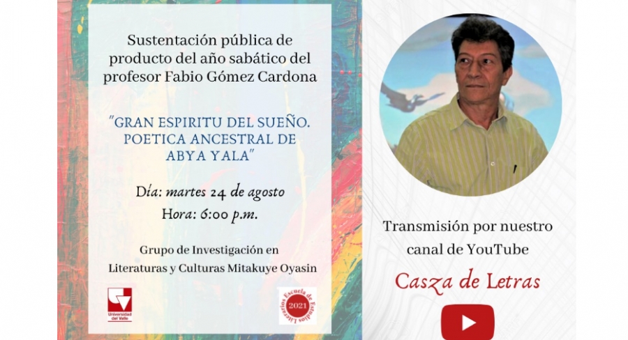 La Escuela de Estudios Literarios de la Universidad del Valle y el Grupo de Investigación en Literaturas y Culturas «Mitakuye Oyasin» invitan a la sustentación pública de producto de año sabático del profesor Fabio Gómez, con el título de «Gran espíritu del sueño. Poética ancestral de Abya Yala».